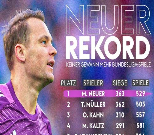 529场363胜,诺伊尔超越穆勒成为德甲历史胜场最多的球员